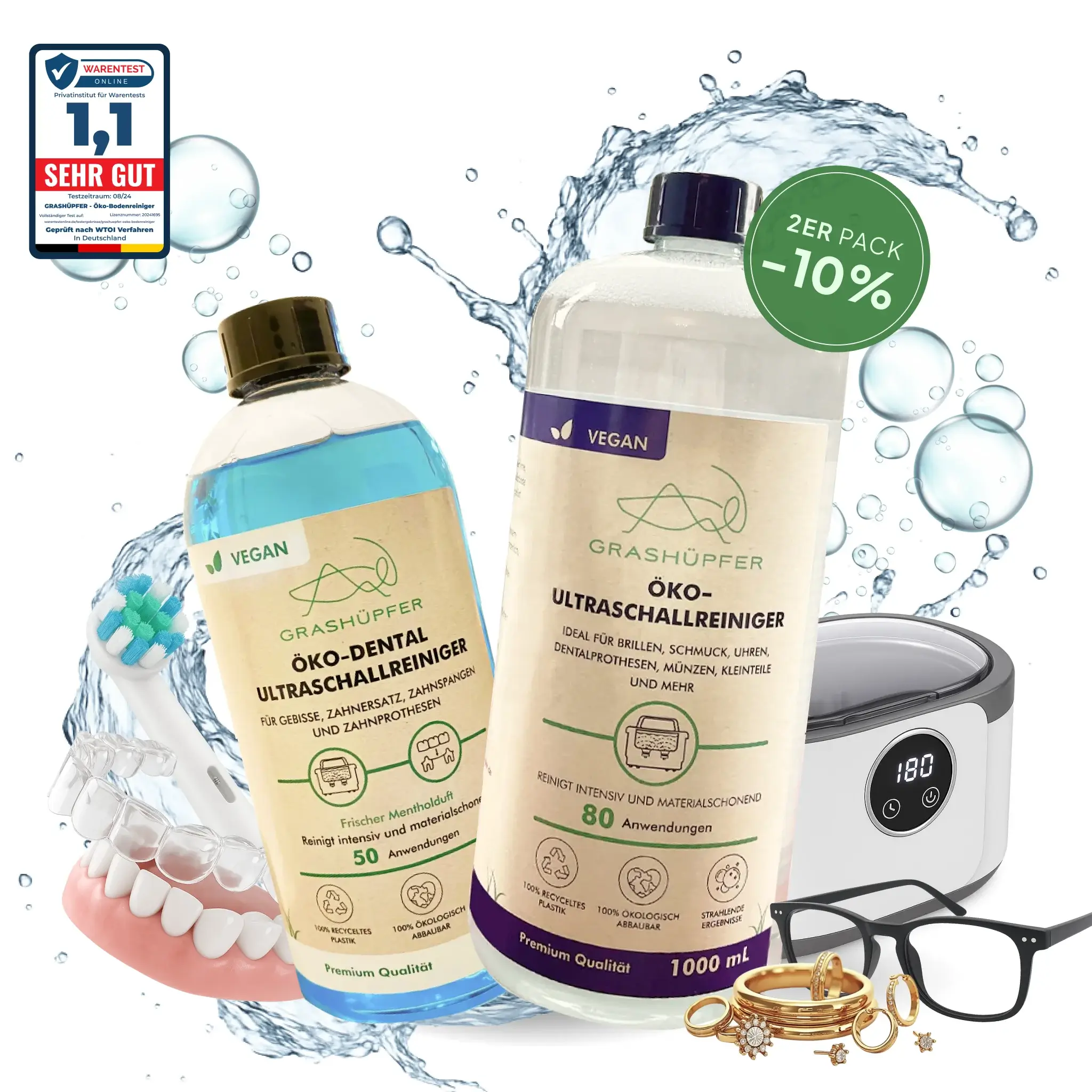 Mit dem Grashüpfer® Öko-Ultraschall Reinigungsduo erhältst du die perfekte Reinigungslösung für Ultraschall-Reinigungsgeräte in einem Set – umweltfreundlich & hochwirksam!